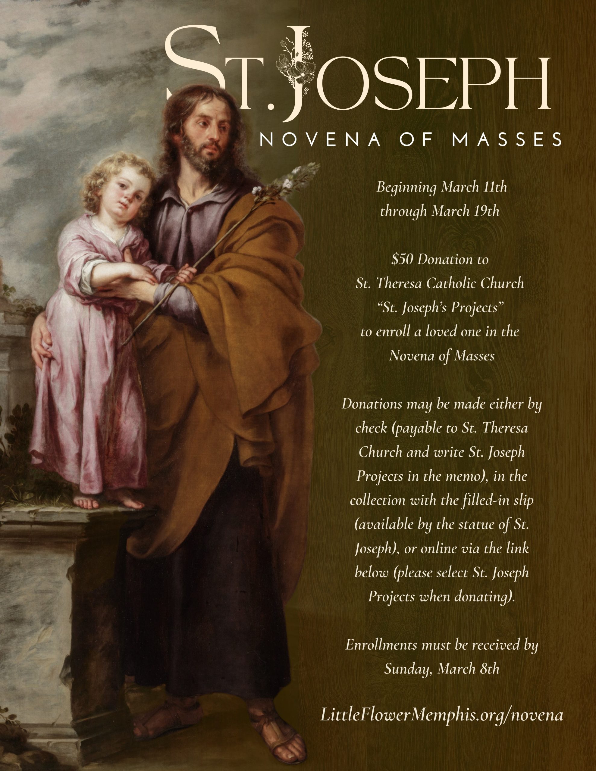 Please fill in all the required fields below and kindly send in your donation of $50 or more either by check (payable to St. Theresa Church and write St. Joseph’s Projects in the memo), in the collection with the filled-in slip (available by the statue of St. Joseph), or online via the link below (please select St. Joseph’s Projects when donating).